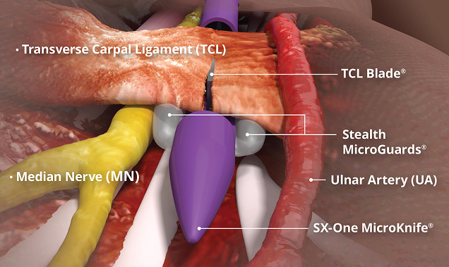 The SX-One MicroKnife is a low-profile, safe, and effective instrument that allows your doctor to perform carpal tunnel release in a matter of minutes. When combined with ultrasound visualization, the procedure requires only a very small (4-5 mm) wrist incision.