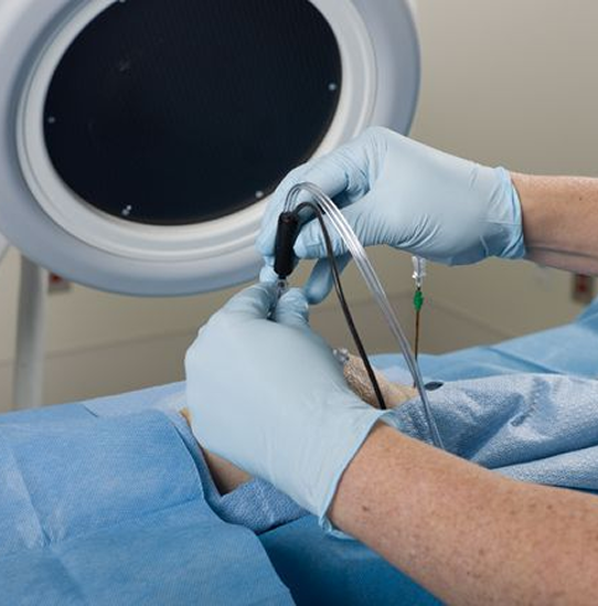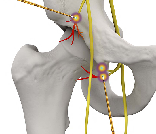 The procedure is performed using fluoroscopic and ultrasound guidance; as the patient’s nerve tissue is heated, water circulates through the COOLIEF device. The nerve thereafter can not conduct the pain sensation from inside the hip or knee joint to the brain. The patient loses no sensation to the skin around the joint. This procedure allows the surgeon to safely target these sensory nerves that are causing the pain.